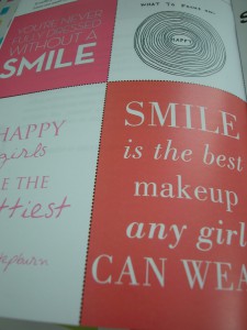 Dans le My Little Notebook, on retrouve des sourires en tout genre, des mots qui font du bien, une playlist de musiques qui collent des fourmis dans les jambes et le sourire aux lèvres! une page blanche pour y noter ses voeux / ses désirs même les plus fous, des conseils pour une Shoes thérapie avec une petite liste de créateurs chouchous qui savent sublimer nos petons fragiles et délicats (si le banquier tique un peut, et bien on lui expliquera simplement que parfois tout le monde a le droit au bonheur) et pour finir une idée de livres qui rendent heureux . . .