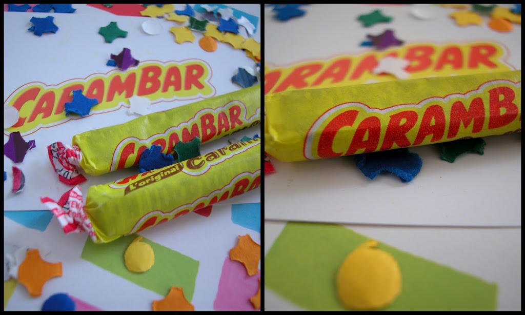 – Mais que vois-je caché sous les confettis? des CARAMBARS . . . miam miam (attention ça colle aux dents ! et c’est à consommer avec modération)